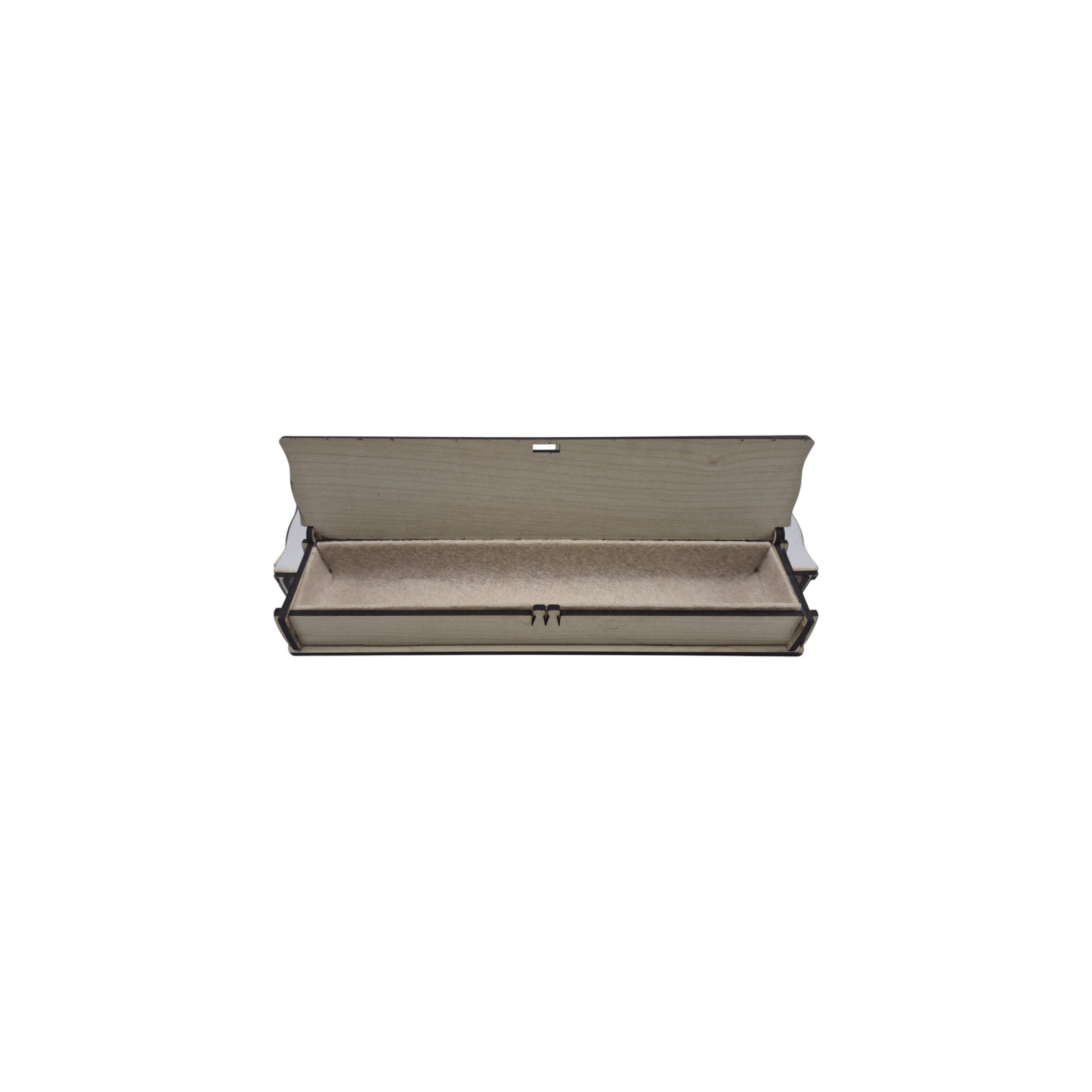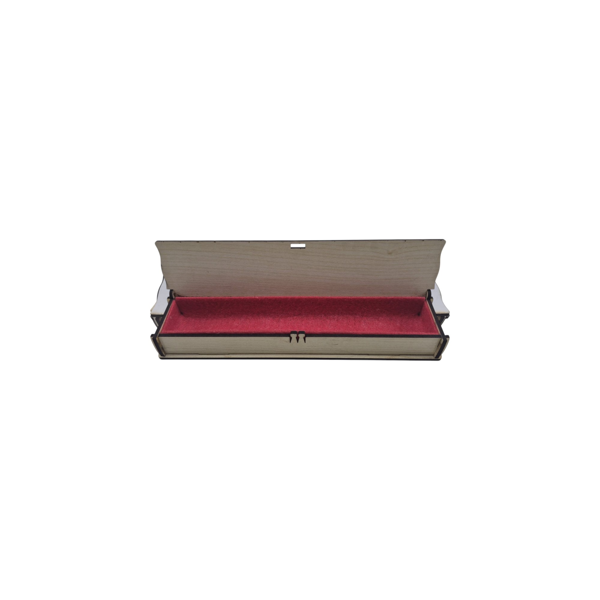 Ahşap (mdf) den lazer kesim ile üretilmiş, içerisine isteğe bağlı olarak kırmızı veya kahverengi keçe döşenmiş olarak satışa sunulmuştur. 20,5x5x3 cm boyutlarındadır. Keçe rengini lütfen satın alma notu kısmında belirtiniz.